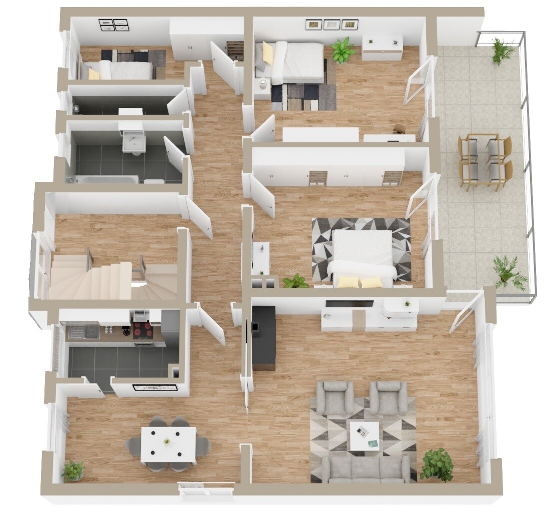 Beide Wohneinheiten sind identisch geschnitten und verfügen über jeweils fünf Zimmer, was eine flexible Nutzung ermöglicht – ob als Mehrgenerationenhaus oder zur Vermietung. Dank der optimalen Südausrichtung sind die Wohnungen besonders hell und lichtdurchflutet, was ein angenehmes Wohngefühl schafft. Die Erdgeschosswohnung punktet mit direktem Zugang zum herrlichen Garten und einer großzügigen, überdachten Terrasse, während die Obergeschosswohnung mit einem weitläufigen Südbalkon überzeugt. In beiden Wohnungen sorgt ein gemütlicher Holzofen für eine behagliche Atmosphäre.