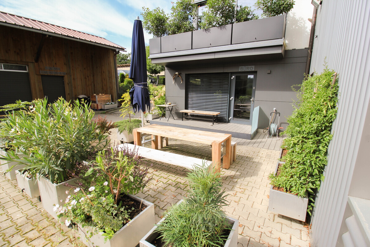 Die Büro-/Sozialfläche umfasst ca. 70 m² mit Bad (Dusche/WC), einem separaten Büroraum für 3–4 Arbeitsplätze, der auch als Umkleide genutzt werden kann, und einem größeren Raum für 6–8 Arbeitsplätze oder für die Arbeitsvorbereitung. Angrenzend befindet sich ein Außenbereich mit Sitzgelegenheiten.