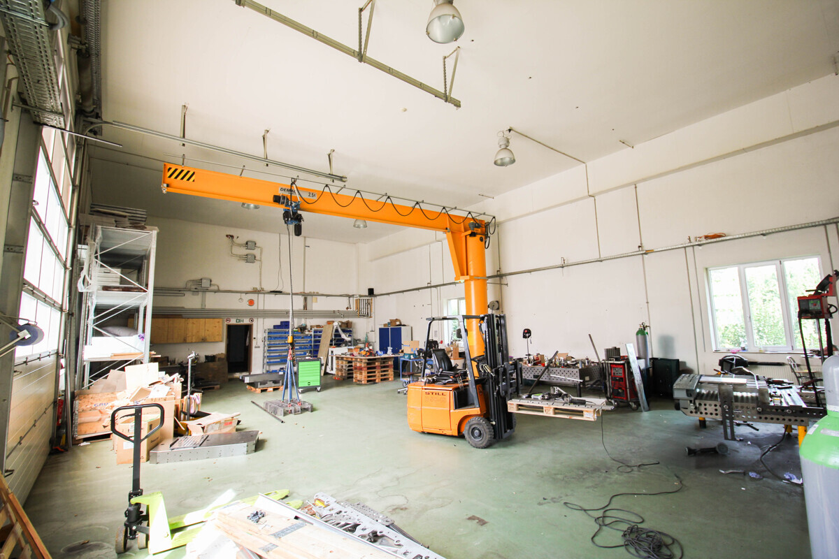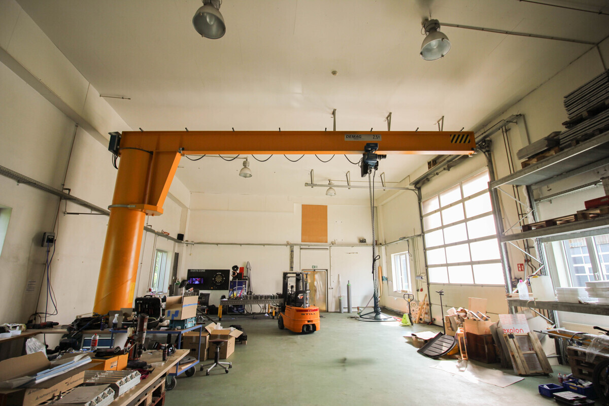 Halle 1 bietet ca. 206 m² und einen Kran mit bis zu 2,5 t Hebelast für innerbetriebliche Hebe- und Umsetzvorgänge.
