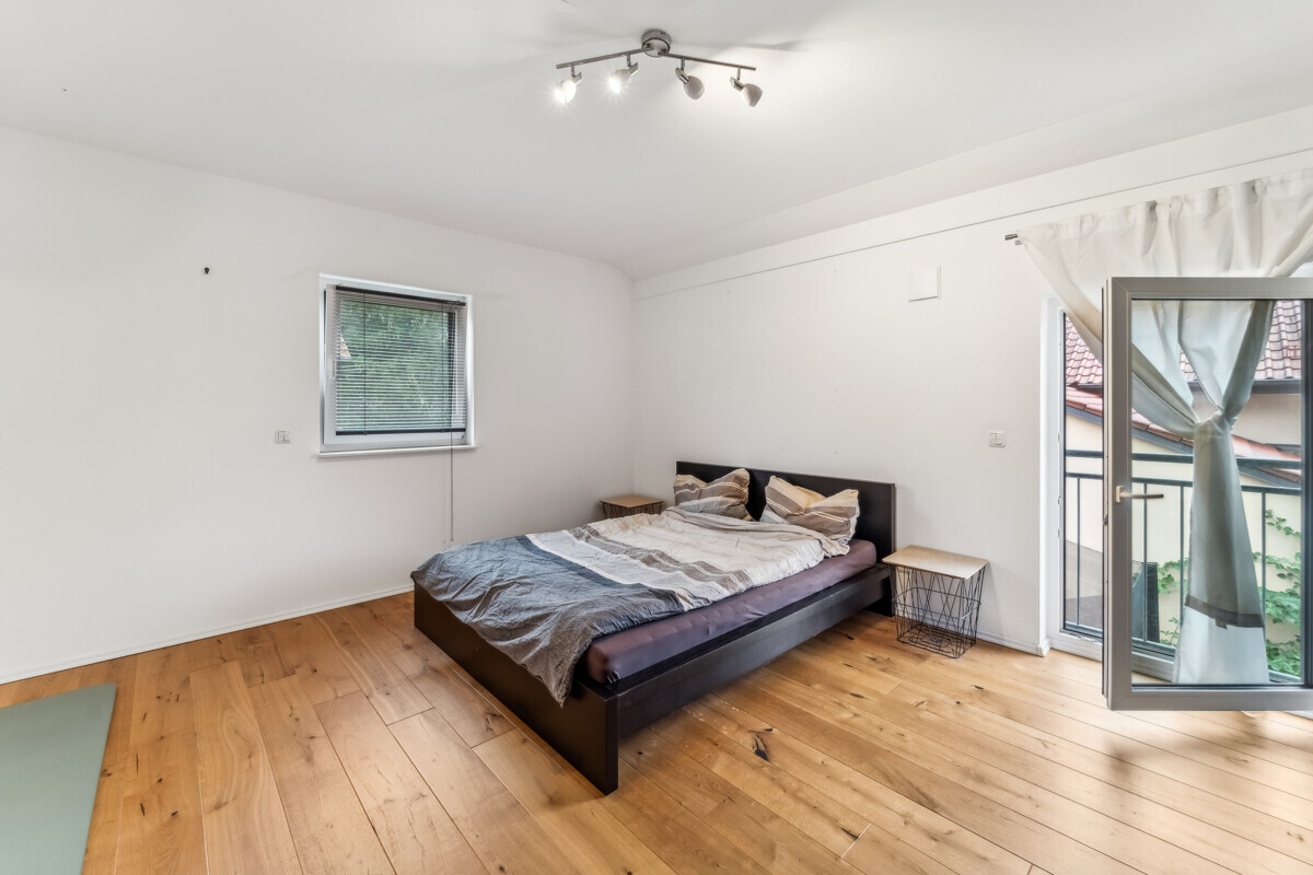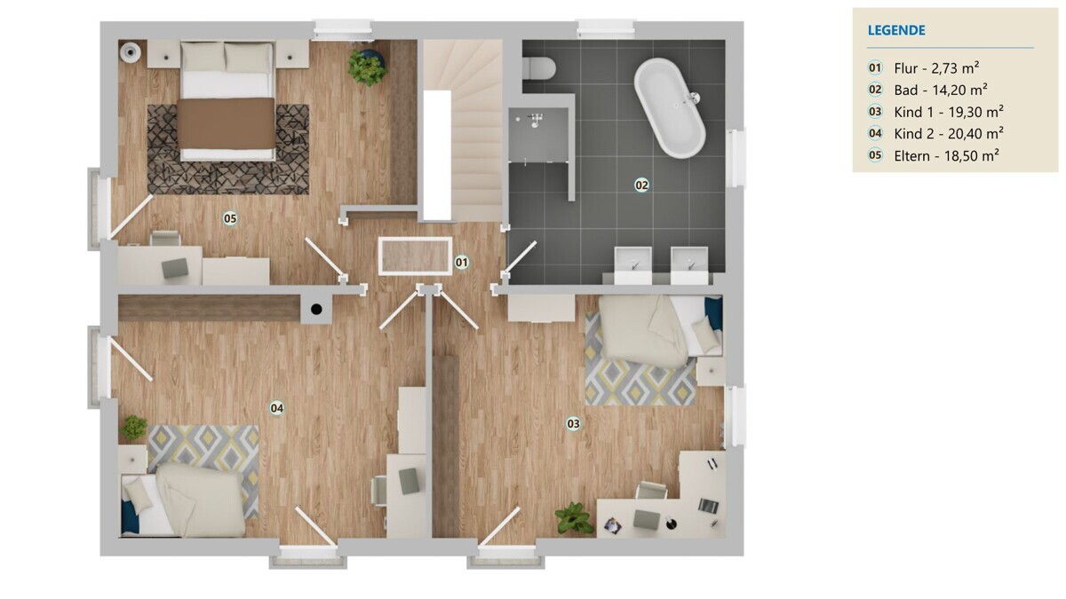 Im Obergeschoss befinden sich zwei große, helle Kinderzimmer sowie ein geräumiges Elternschlafzimmer mit Platz für einen großen Kleiderschrank. Alle Zimmer sind mit hochwertigen Eiche-Edeldielen ausgestattet, die eine warme, elegante Wohnatmosphäre schaffen. Das stilvolle Bad bietet eine freistehende Wanne, einen Doppelwaschtisch und moderne Armaturen – ein Ort zum Entspannen.