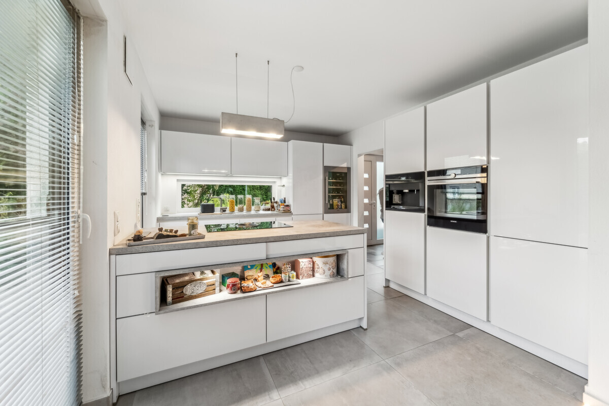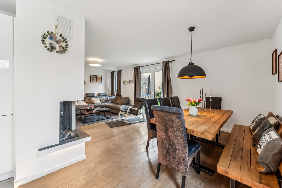 Im Erdgeschoss bildet der großzügige Wohn- und Essbereich das Herzstück des Hauses. Eine moderne, in den Raum integrierte Küche mit gehobener Ausstattung lässt keine Wünsche offen. Ein hochwertiger Gaskamin sorgt für Behaglichkeit, große Fensterflächen für ein helles, offenes Wohngefühl. Edeldielen aus Eiche, LED-Lichtbänder im Fußboden, elektrische Rollläden und Naturstein-Fensterbänke unterstreichen den gehobenen Wohnstil. Ergänzt wird die Etage durch ein modernes Duschbad.
