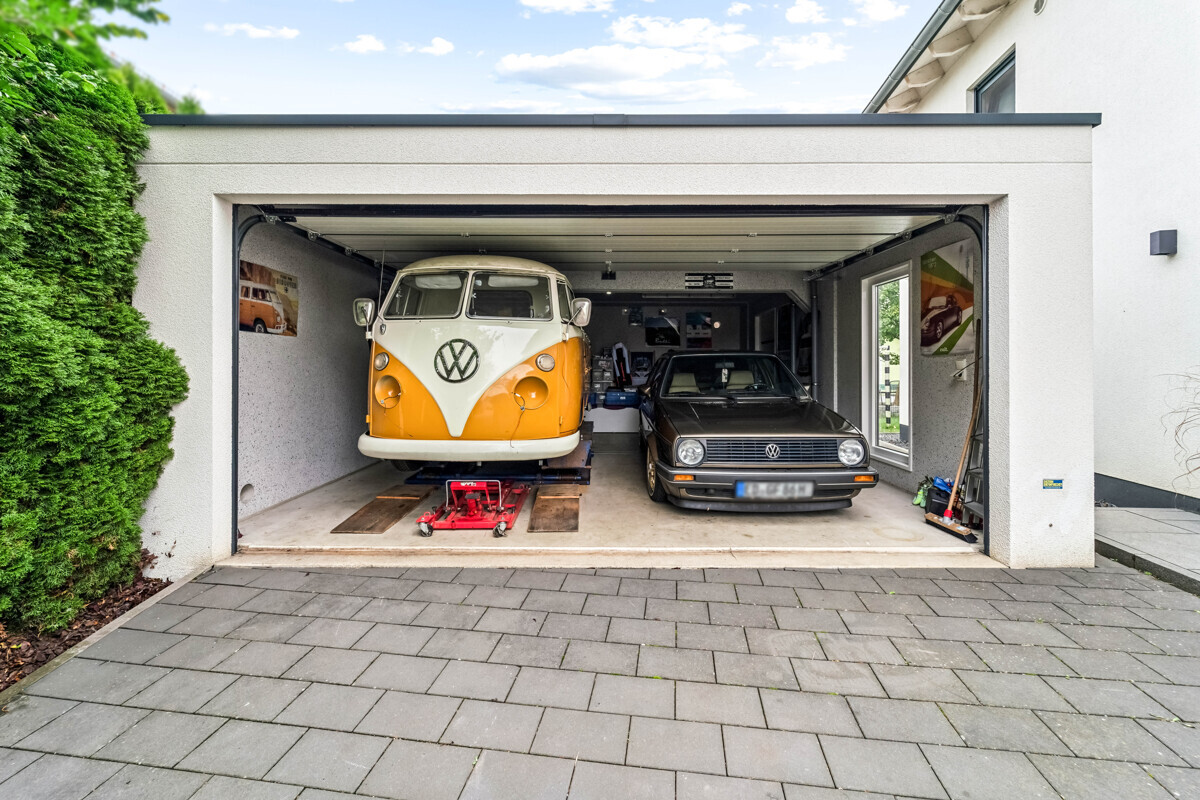 Das 509 m² große Grundstück bietet einen gepflegten Garten und eine großzügige Terrasse für entspannte Stunden im Freien. Eine Doppelgarage bietet Platz für zwei Fahrzeuge und Stauraum.
