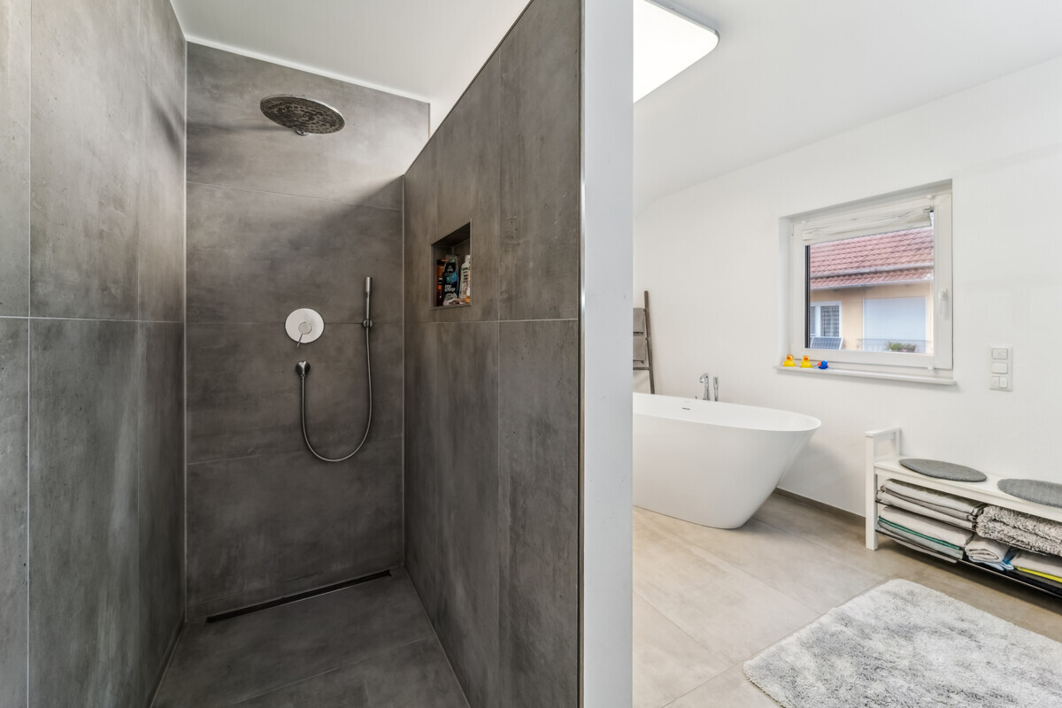 Große frei begehbare Dusche im Badezimmer im Obergeschoss